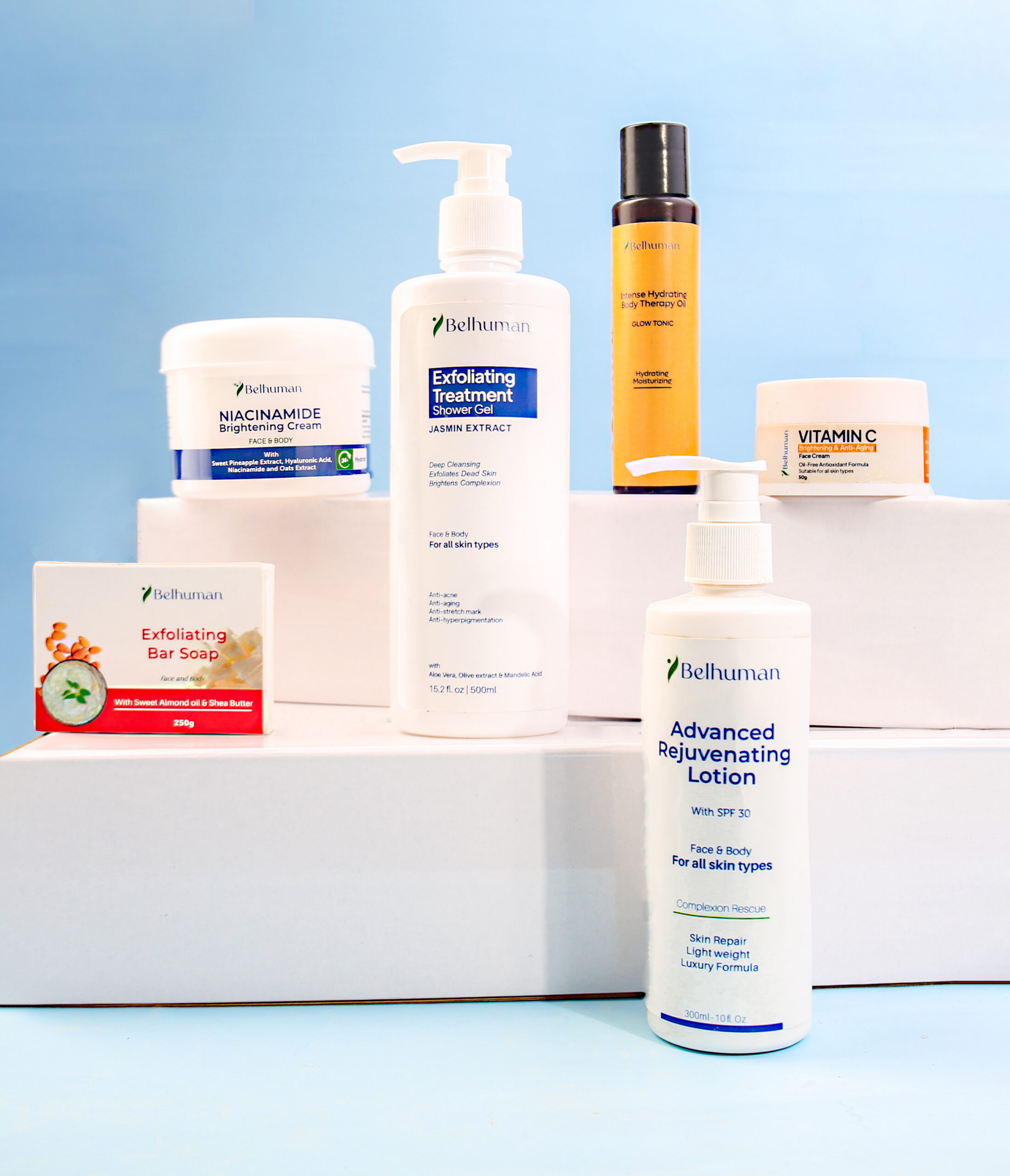 What’s in the set: Exfoliating Treatment Shower Gel · Hydrating Toner · Niacinamide Brightening & Hydrating Serum · Vitamin C Brightening & Anti-Aging Face Cream · Niacinamide Brightening Cream · Intense Hydrating Body Therapy Oil